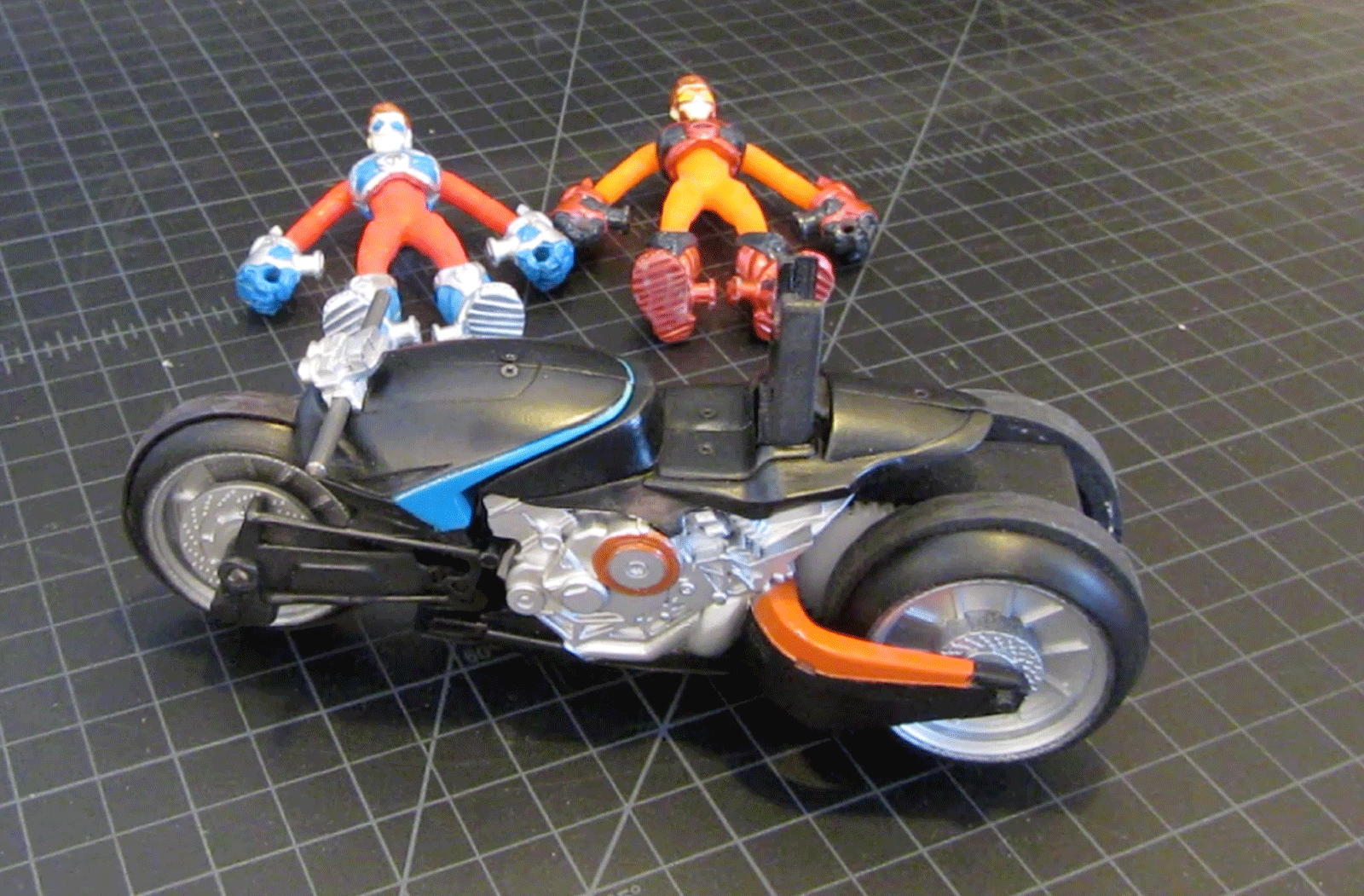 Action prototypes are prototypes with performance, function and stunts. Our paint finishes survive actual use pretty well. Here is a motorcycle that our prototype lab created and we finished up the figures and motorcycle to look close to production.